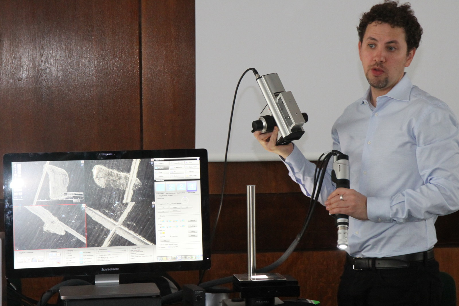 Spotkanie otworzył dr hab. inż. Jerzy Potencki, prof. PRz z Katedry Systemów Elektronicznych i Telekomunikacyjnych, zachęcając zebranych do wysłuchania i zapoznania się z możliwościami wielofunkcyjnego i najnowocześniejszego mikroskopu RH- 2000 3D Hirox. Prezentację poprowadzili Katarzyna Piekarska i Emilien Leonhardt z Hirox. Przybliżyli historię firmy oraz przedstawili zalety urządzenia: inspekcję na żywo zapisu filmów, tworzenie obrazu panoramicznego, kontrolę jakości, badanie powierzchni, dużą rozdzielczość. Mikroskop dokonuje m.in. pomiarów 2 i 3D oraz profilowania 3D, pomiaru powierzchni i objętości, łączenia obrazów 3D.