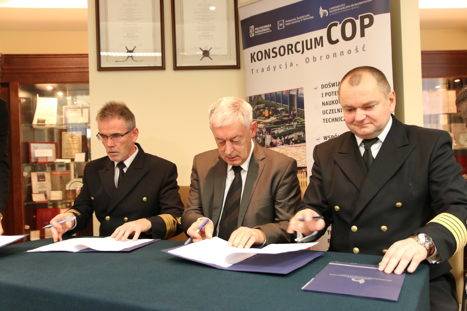 18 listopada w Sali Senatu Uniwersytetu Technologiczno-Humanistycznego im. Kazimierza Pułaskiego w Radomiu prof. dr hab. inż. Tadeusz Markowski - rektor Politechniki Rzeszowskiej im. Ignacego Łukasiewicza, prof. dr hab. inż. Wiesław Trąmpczyński - rektor Politechniki Świętokrzyskiej, dr hab. inż. kpt. ż.w. Wojciech Ślączka - rektor Akademii Morskiej w Szczecinie, prof. dr hab. inż. Jerzy Zarębski - rektor Akademii Morskiej w Gdyni, oraz prof. dr hab. inż. Zbigniew Łukasik - rektor Uniwersytetu Technologiczno-Humanistycznego, uroczyście podpisali deklarację rozszerzenia Konsorcjum COP - Tradycja, Obronność.