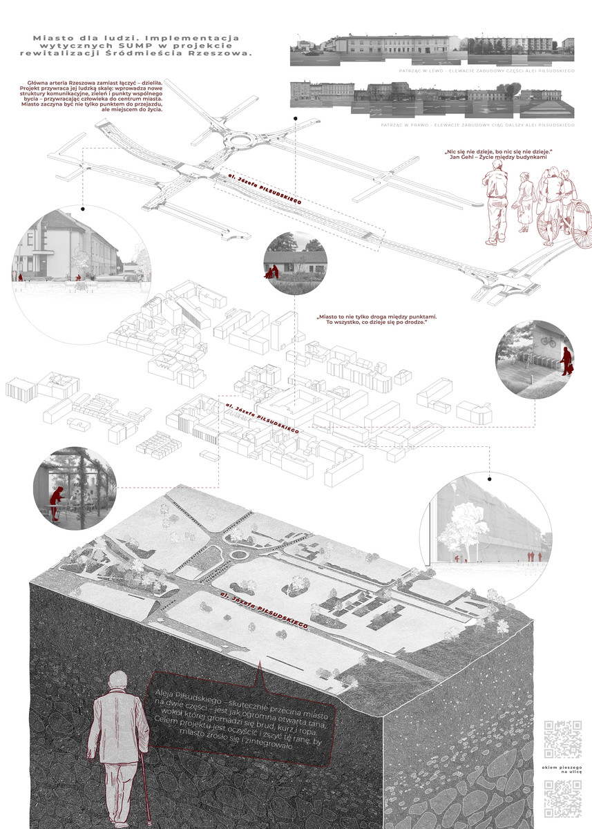 Nagrodzona praca podejmuje aktualny problem jakości przestrzeni śródmiejskich w miastach średniej wielkości oraz potrzebę projektowania opartą na zasadach zrównoważonej mobilności miejskiej (SUMP – Sustainable Urban Mobility Plan). Projekt stanowi kompleksową wizję rewitalizacji wybranych obszarów Rzeszowa, ukierunkowaną na odzyskanie miasta dla pieszych, integrację społeczną oraz tworzenie stref sprzyjających codziennemu życiu mieszkańców.