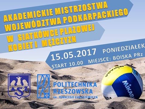 Zapraszamy na Akademickie Mistrzostwa Województwa Podkarpackiego w piłce siatkowej plażowej kobiet i mężczyzn, które odbędą się w poniedziałek 15 maja br. na boiskach Politechniki Rzeszowskiej, rozpoczęcie około godz.10.00.
