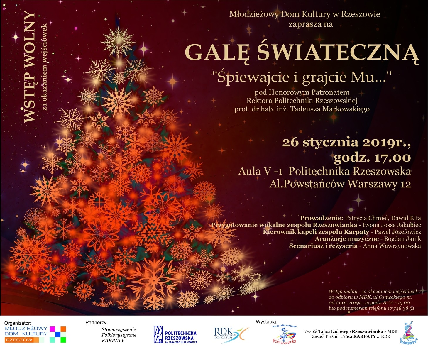 Młodzieżowy Dom Kultury w Rzeszowie zaprasza na Galę Świąteczną „Śpiewajcie i grajcie Mu...”. Gala odbędzie się 26 stycznia o godzinie 17.00 w auli V-1 Politechniki Rzeszowskiej. Patronat honorowy nad koncertem objął rektor Politechniki Rzeszowskiej prof. dr hab. inż. Tadeusz Markowski.