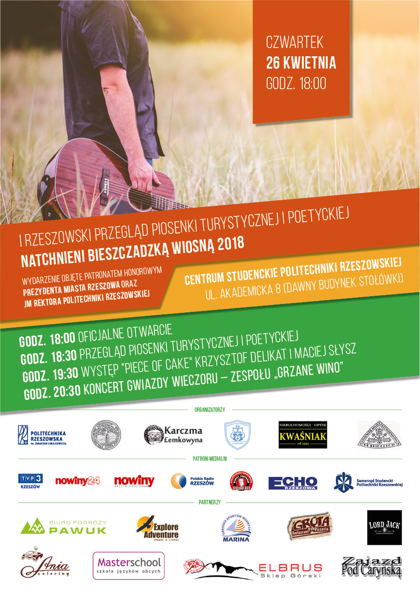 Na I Podkarpacki Przegląd Piosenki Turystycznej i Poetyckiej „Natchnieni Bieszczadzką Wiosną 2018” zapraszają: Stowarzyszenie „Natchnieni Bieszczadem” w Cisnej, Politechnika Rzeszowska, Optyk i Nieruchomości KWAŚNIAK, Karczma ŁEMKOWYNA, Studenckie Koło Przewodników Beskidzkich SKPB, Szkoła Podstawowa nr 16 w Rzeszowie.